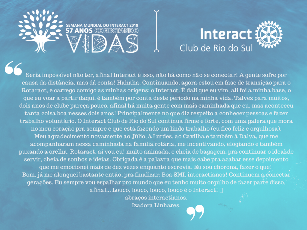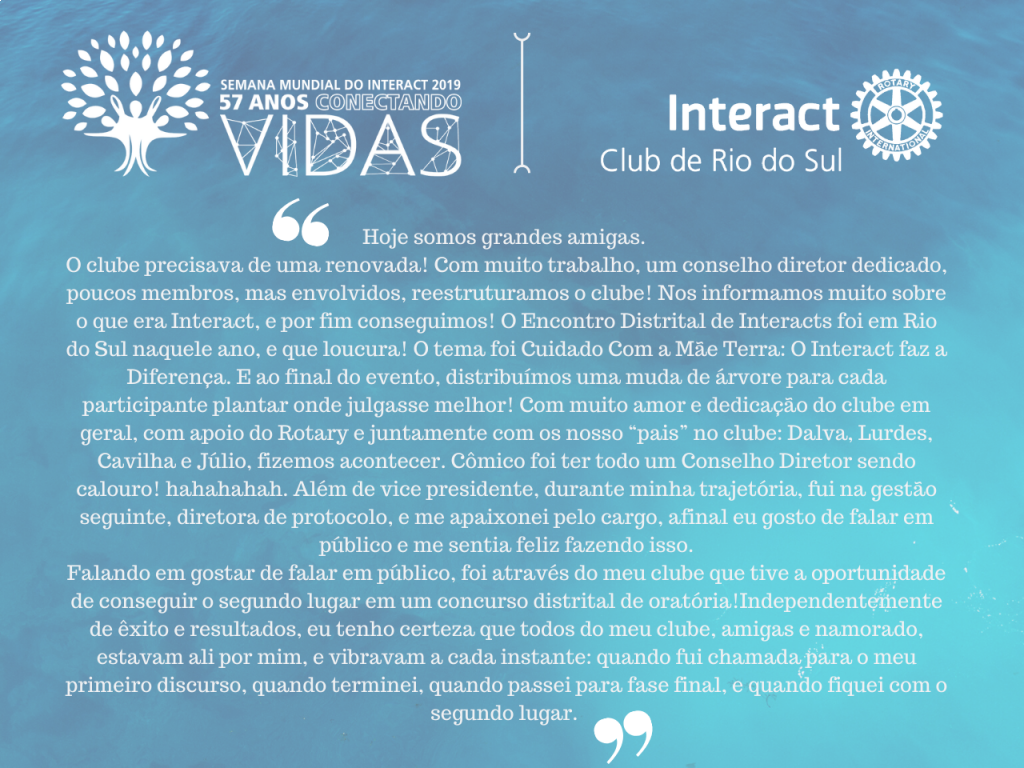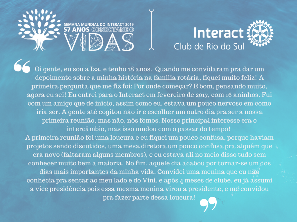 A proposta de hoje foi: conectando o futuro. A fim de compartilhar com o público a caminhada rotária de duas pessoas muito especiais para esse clube, pedimos que elas fizessem um depoimento de sua jornada no Interact.